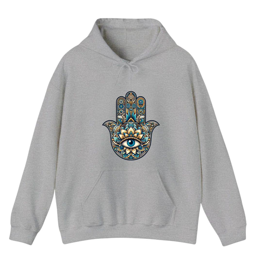 هودي رمادي للجنسين - مطبوع عليه يد حمسه باللون الأخضر